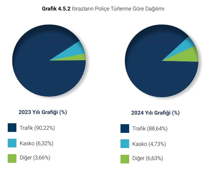 Poliçe türlerine göre başvurularda trafik, başvuruların açık ara en büyük bölümünü oluşturuyor. 2023’teki başvuruların %94,74’ü, 2024’te ise %94,09’u trafikten oluşuyor.