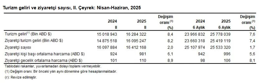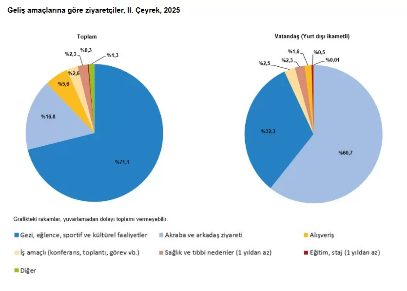 Ülkemizden çıkış yapan ziyaretçi sayısı 2025 yılı II. çeyreğinde bir önceki yılın aynı çeyreğine göre %2 artarak 16 milyon 412 bin 168 kişi oldu. Ziyaretçilerin %16,3’ünü 2 milyon 678 bin 105 kişi ile yurt dışında ikamet eden vatandaşlar oluşturdu.
