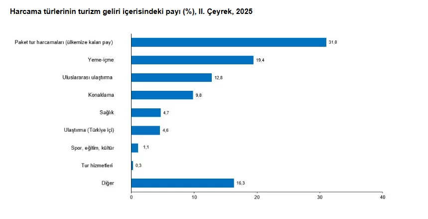 Bu çeyrekte ziyaretçilerden elde edilen turizm geliri içerisindeki paket tur harcamalarının payı %31, yeme içme harcamalarının payı %19,4, uluslararası ulaştırma harcamalarının payı ise %12,8 oldu. Bir önceki yılın aynı dönemine göre uluslararası ulaştırma harcamaları %13,8, yeme içme harcamaları %13,7 ve tur hizmetleri harcamaları %12,5 arttı.